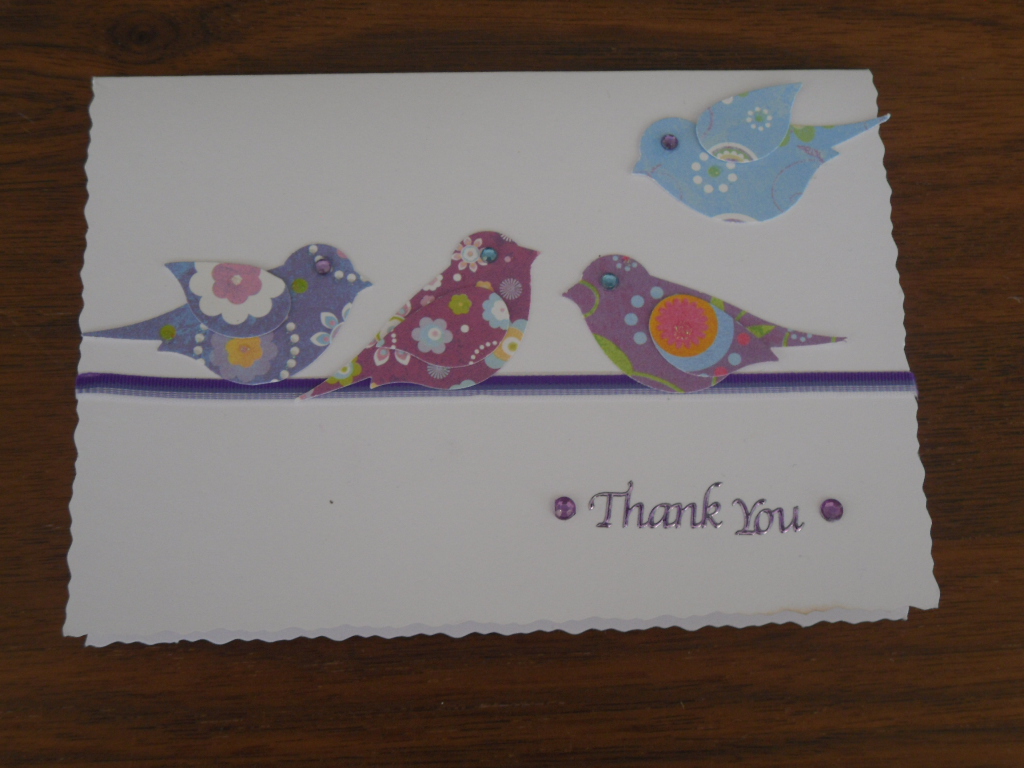 Last is my favourite of this series. Simple little bird punch in the four busiest pattern papers, simple little bling eye and some great purple sticky ribbon. I punched them facing different directions to make them look like they were interacting. It’s a bit modern and a bit twee at the same time. Which is kind of my style, come to think of it.